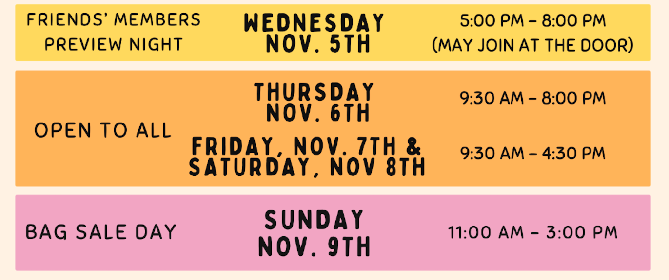 Meeting Dates Donate Books Join the Friends Contact the Friends Volunteers work year-round to screen donated books and box them for storage. With the wonderful support of our volunteers and community, the Friends can continue funding dynamic programs at our vibrant library. 2025 Dates Preview Night: Wed Nov 5th, 5pm – 8pm (new memberships available at the door) Preview Night Rules Thurs Nov 6th, 9:30am – 8pm Fri Nov 7th, 9:30am – 4:30pm Sat Nov 8th, 9:30am – 4:30pm Sun Nov 9th, 11am – 3pm